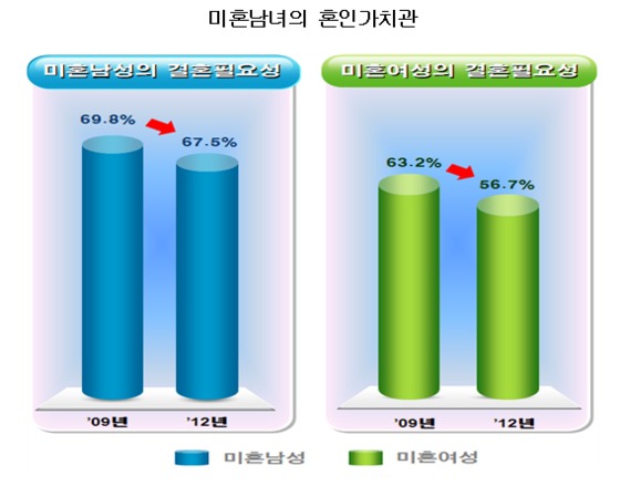 이 조사에서 결혼 필요성에 대한 긍정적 대답은 남녀 모두 감소했다. 2009년에 비해 미혼남성은 69.8%에서 67.5%, 미혼여성은 63.2%에서 56.7% 등으로 줄었다.