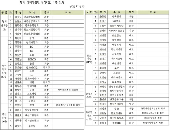 전국경제인연합회(회장 허창수)는 경제5단체장과 5대 그룹 회장 등이 포함된 박 대통령의 경제사절단 51명을 발표했다. 이는 역대 최대규모.