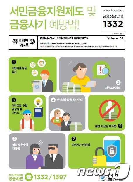 금융소비자리포트 3호는 ▲서민대출상품 ▲채무조정제도 ▲대학생을 위한 금융생활 가이드 ▲금융사기 등 금융피해 예방법 등의 내용을 담았다.
