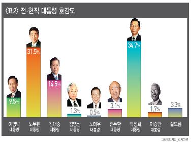 전ㆍ현직 대통령 호감도, “박정희 34.7% Vs. 노무현 31.5%”