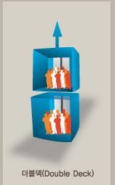 더블덱 엘리베이터는 한 개의 승강로에 2대의 엘리베이터를 수직으로 연결해 엘리베이터 두 대가 함께 붙어서 움직이는 방식이다. 2개 층을 동시에 운행할 수 있어 승객의 탑승 및 대기 시간을 단축함과 동시에, 기존 엘리베이터 [싱글덱(Single Deck)] 대비 2배의 수송능력을 발휘할 수 있어 효율적이다.