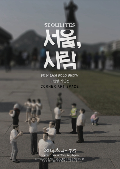 라선영은 서대문 재개발 현장에서 주워온 벽 조각 위에 목각인형들을 낮게 배치한다. 관객은 신이 인간을 내려다 보듯 작가의 <서울, 사람>을 내려다 본다.