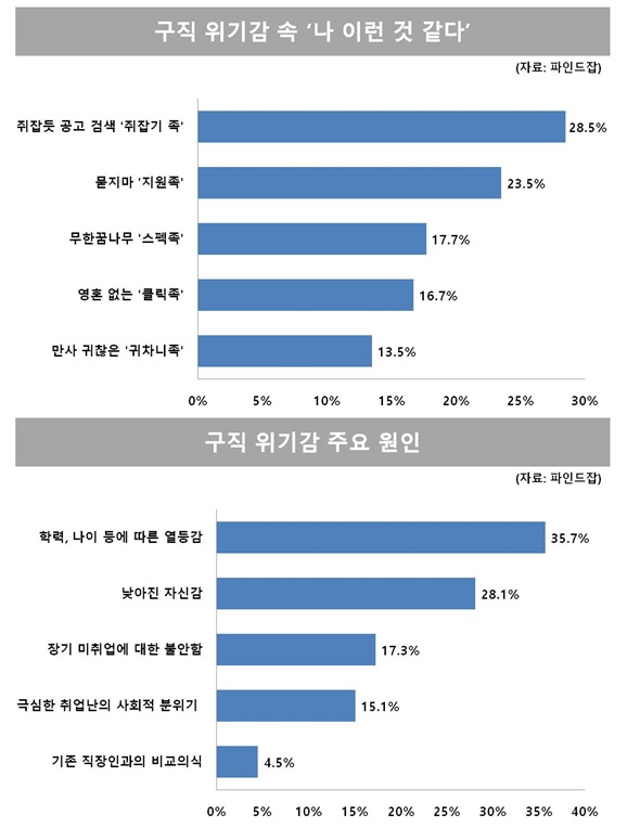 이어 △2위는 일단 모든 공고에 무조건 지원하고 보는 묻지마 ‘지원족’(23.5%), △3위 더 좋은 취업을 위해 스펙을 높이는데 열과 성을 다하는 무한꿈나무 ‘스펙족’(17.7%), △4위 무의식적으로 취업 포털, 취업 까페 등 취업관련 사이트에 장시간 접속해 있는 영혼 없는 ‘클릭족’(16.7%), △5위 어차피 안될 거란 생각에 이판사판 대충 준비하는 만사 귀찮은 ‘귀차니족’(13.5%)순이었다.