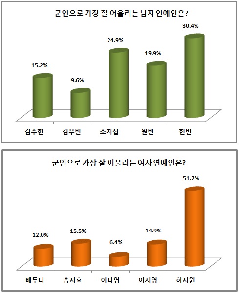 ‘군인으로 가장 잘 어울리는 여자 연예인’은 하지원이 51.2%(480명)로 압도적인 지지를 얻으며 1위에 올랐다. 송지효와 이시영은 각각 15.5%(145명)와 14.9%(140명) 순이었으며, 배두나는 12.0%(113명), 이나영 6.4%(60명) 이었다.