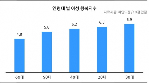 또한 스트레스지수에서도 30대의 스트레스 수치가 6.9점으로 가장 높았다. 여성 평균 스트레스지수는 6.5점으로 30대만이 평균보다 높았으며, △20대 6.5점, △40대 6.2점, △50대 5.8점, △60대 4.8점으로 연령대가 높아질수록 스트레스 수치가 낮았다.