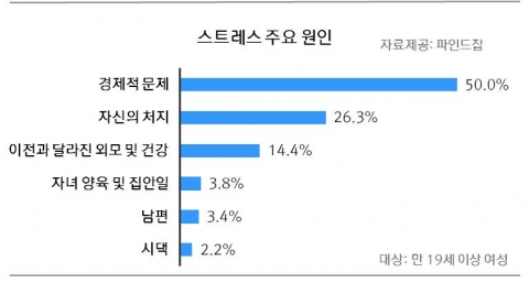 이어 △2위 멀어진 꿈, 주부로서의 삶 등의 ‘자신의 처지’(26.3%), △3위 ‘이전과 달라진 외모 및 건강’(14.4%), △4위 ‘자녀 양육 및 집안일’(3.8%), △5위 ‘남편’(3.4%), △6위 ‘시댁’(2.2%)순이었다.