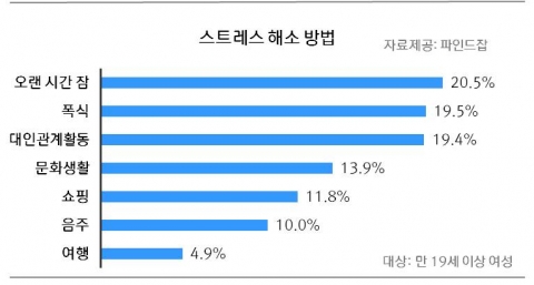 이와 함께 여성들은 주로 ‘잠’과 ‘먹을 것’으로 스트레스를 푸는 것으로 나타났다. 주요 스트레스 해소법을 물어본 결과 △1위 ‘오랜 시간 잠’(20.5%), △2위 ‘폭식’(19.5%)이 차지했다.