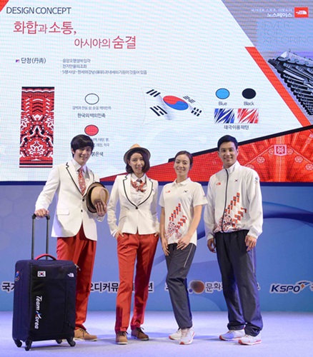 인천아시아경기대회 선수단복은 화합과 소통, 아시아의 숨결을 테마로 대한민국의 상징인 태극 무늬에 한국의 아름다움을 느낄 수 있는 단청 무늬를 조합했다. 또 붉은색과 흰색을 주요 색상으로 사용해 한국인의 열정과 백의민족의 기상을 표현했다.