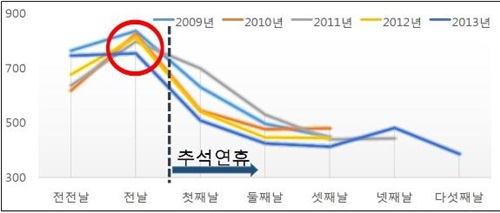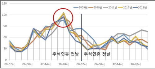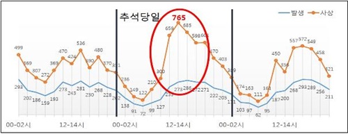 추석연휴기간 중에는 추석날 정오에 교통사고 사상자가 가장 많은 것으로 나타났다.
