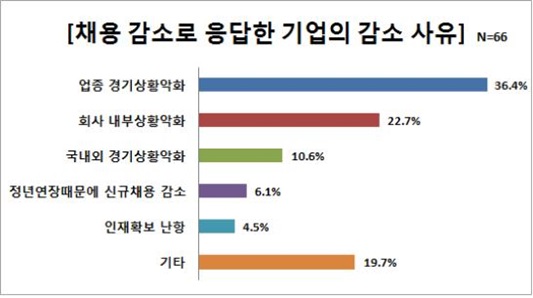 신규채용을 줄이는 이유로는 '해당 업종 경기 악화' 36.4%로 가장 많았고 '회사 내부 상황 악화' 22.7%, '국내·외 경기 상황 악화' 10.6% 등이 뒤를 이었다.