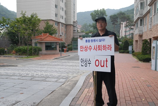 17일 오전에는 진해주민발전추진위원회 소속 이성섭 전 창원시의원은 안상수 창원시장의 자택 앞에서 안 시장의 사퇴를 촉구하는 1인 시위를 진행했다.