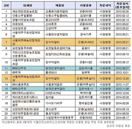 특히 서울탁주의 ‘장수막걸리’에서는 지난해 5월 31일과 9월 12일, 12월 30일 각각 초파리와 나방, 하루살이가 적발됐다.