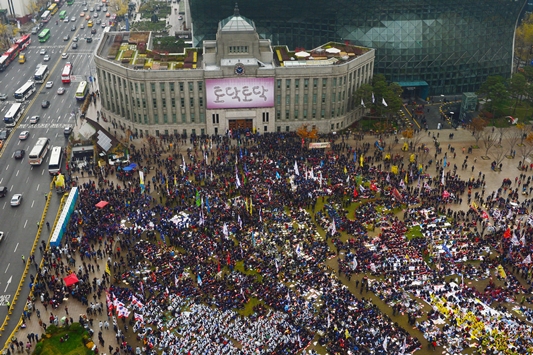 한 시간 뒤 열린 본 대회에는 26개 한국노총 산하 조직원 3만여명(경찰추산 1만명)이 참가해 서울광장을 가득 메웠다.