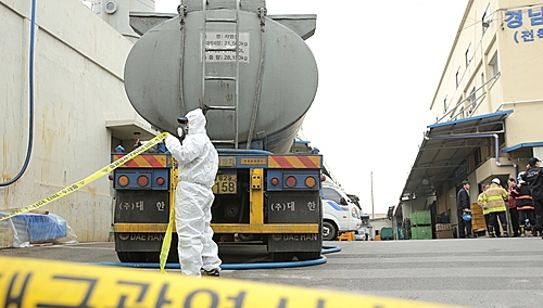소방당국 등에 따르면 이날 사고는 탱크로리 차량에서 공장 옥상의 저장탱크에 차아염소산염을 주입하는 과정에서 발생했다.