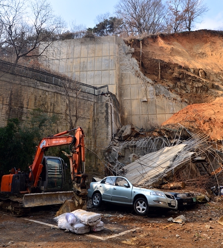 5일 오전 3시50분께 광주 남구 봉선동 대화아파트 뒷편에 설치된 높이 15m, 길이 20m 가량의 옹벽이 붕괴됐다.
