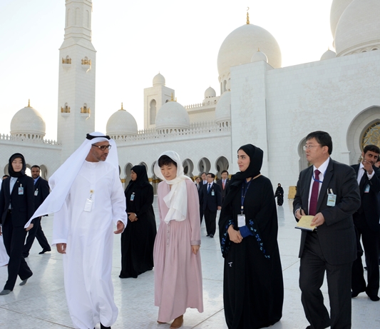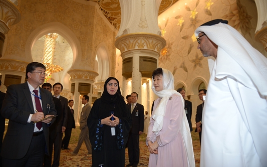 신발을 벗고 그랜드 모스크에 들어선 박 대통령은 1200명이 수작업으로 제작했다는 카펫과 무게만 12톤에 달한다는 초대형 샹들리에 등을 둘러본 뒤 "이슬람의 다양한 건축양식을 아우르고 포스트 모던 디자인까지 융합시킨 것으로 알고 있다"며 "UAE가 지향하는 다양성과 포용성을 잘 보여주는 그랜드 모스크가 아닌가 생각한다"고 말했다.