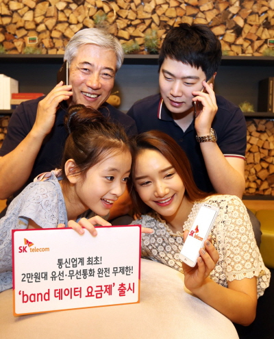 SK텔레콤은 2만원대 요금제에 '무선'은 물론 '유선' 통화까지 무제한 제공하는 'band 데이터 요금제'를 20일 출시한다고 19일 밝혔다.