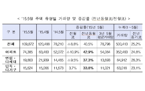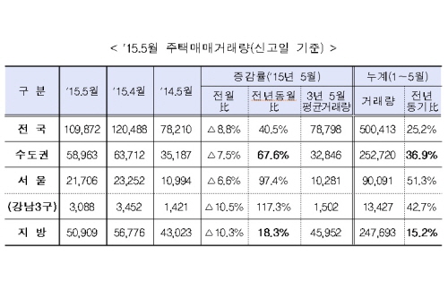 국토교통부는 9일 지난달 주택 매매거래량이 10만9872건으로 전월보다 8.8% 감소했지만 전년 동기 대비로는 40.5% 증가했다고 밝혔다. 이는 2006년 해당 통계를 집계하기 시작한 이래 5월 실적 중 최대 기록이다.