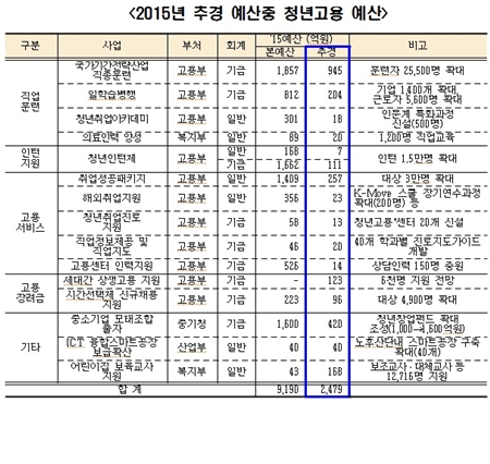 고용서비스 지원에는 327억원을 추가 투입하고 취업성공패키지에 257억원, 해외취업에 23억원, 청년취업진로에 13억원, 직업지도에 20억원, 고용센터인력지원에 14억원을 각각 지원한다.