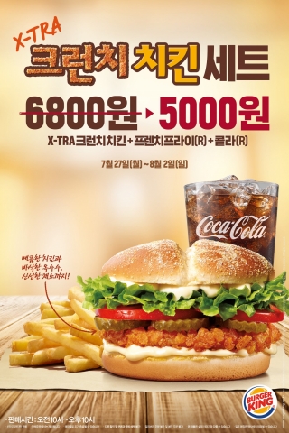엑스트라 크런치 치킨, 프렌치프라이(R), 콜라(R)로 구성된 세트 할인 행사는 7월 27일부터 8월 2일까지 일주일간 버거킹 전국 매장에서 진행된다. (단, 일부 매장 제외)