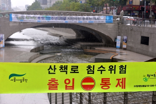 [뉴스엔뷰] 청계천시설관리공단은 8일 갑작스레 쏟아진 소나기로 인한 침수를 우려해 오후 1시께부터 청계천 청계광장부터 황학교까지 총 4㎞ 구간 산책로 출입을 통제하고 있다고 밝혔다.
