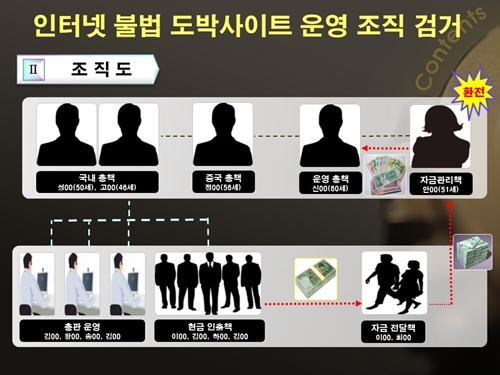 경찰 조사 결과 이들은 지난해 3월 미국에 서버를 두고 도박사이트를 개설, 국내에 본사와 총판, 매장을 두는 기업형으로 중국 총잭의 지시를 받아 운영하며 불특정 다수에게 문자메시지를 보내 회원들을 모집했다.