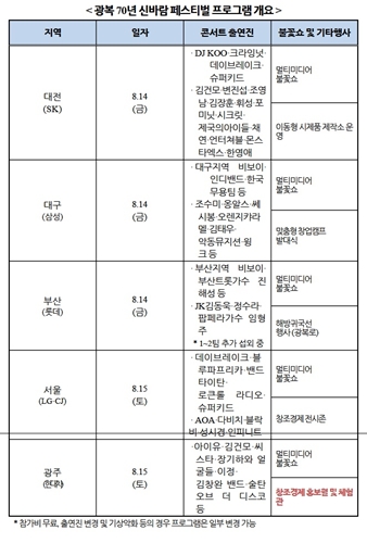 광복절에 진행되는 서울과 광주에 한류스타들과 여러 연령대가 공감할 수 있는 가수들이 무대에 오른다.