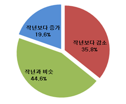 올해 경력직을 포함한 신규채용 규모는 44.6%가 '작년과 비슷하다'고 답했고, '작년보다 감소'는 35.8%, '작년보다 증가'는 19.6%였다.