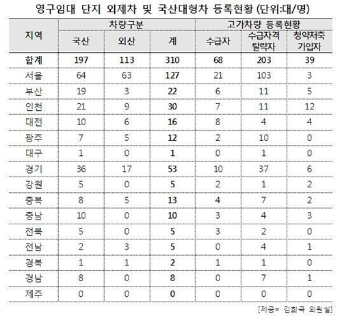 18일 국회 국토교통위원회 새누리당 김희국 의원이 한국토지주택공사(LH)에서 제출받은 자료에 따르면 지난달 현재 전국 영구 임대주택 단지에 등록된 외제차는 113대, 국산 대형차는 197대 등으로 고급 승용차가 총 310대로 조사됐다.