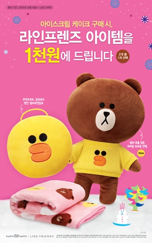 뿐만 아니라 12월 18일부터 아이스크림 케이크 구매 시 라인프렌즈 아이템을 1,000원에 판매하는 ‘라인프렌즈 아이템’ 프로모션을 진행한다.