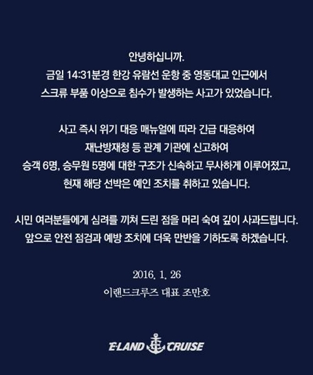 이 사고로 이랜드크루즈 조만호 대표는 공식 SNS를 통해 이날 발생한 유람선 사고에 대해 "시민 여러분들께 심려를 끼쳐 드린 점을 머리 숙여 깊이 사과드립니다"라면서 "앞으로 안전 점검과 예방 조치에 더욱 만반을 기하도록 하겠습니다"고 사과했다.
