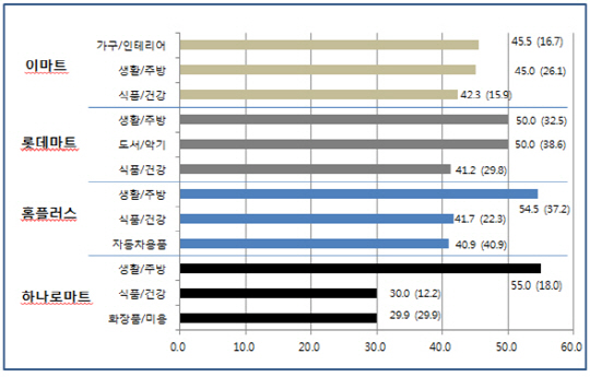 이마트는 최고마진율(평균마진율) 45.5%(18.2%), 롯데마트 50.0%(33.3%), 홈플러스 54.5%(27.8%), 하나로마트는 55.0%(11.9%)로 나타났다.
