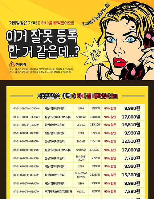 오전 10시부터 10시30분까지 캐논 잉크젯 복합기(E569)를 9만9900원에서 90% 할인된 9990원에, 11시부터 11시30분까지 삼성 24인치 LED모니터(S24D340)를 17만원에서 90% 할인된 1만7000원에 구매 가능하다.