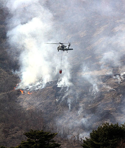 불이 나자 산림헬기 2와 임차헬기, 군 헬기 등 4대를 투입해 진화에 나서 7시간 30분만에 진화됐으나 불발탄 사고 우려 등 접근이 어려워 진화에 어려움을 겪었다.