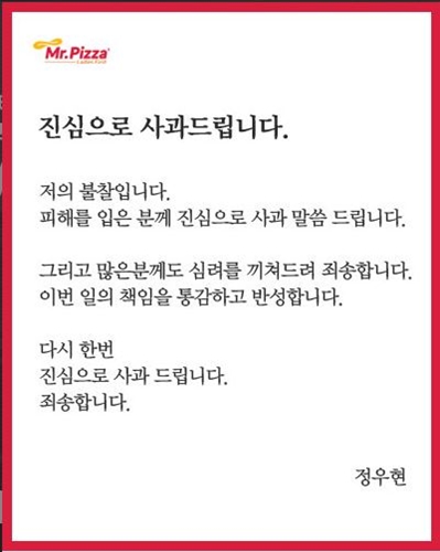 [뉴스엔뷰] 경비원 폭행 논란에 휩싸인 정우현 MPK그룹 회장이 미스터피자 공식 홈페이지를 통해 사과했다.