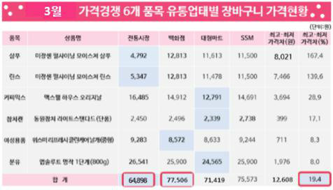 또 커피믹스(맥스웰 하우스 오리지널), 참치캔(동원참치 라이트 스탠더드), 분유(앱솔루트 명작 1단계) 등의 제품은 대형마트가, 여성용품(위스퍼 리프레시 클린케어)은 백화점이 최저가를 기록했다.