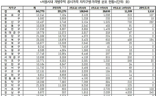 반면 강남구(502가구)와 서초구(600가구) 등은 3억원 이하 주택수가 상대적으로 적었다.
