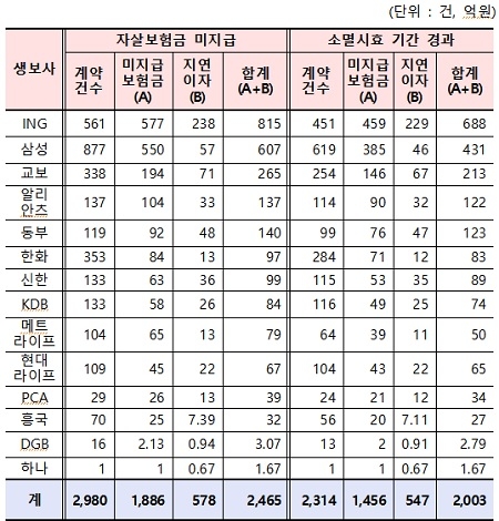 보험사들은 자살 특약보험 수익자가 보험금을 청구할 경우 일반사망 보험금만 지급하는 식으로 ING생명 등 14개 보험사가 덜 지급한 자살 보험금은 지난 2월 말 기준으로 2465억원(지연이자 포함)이다. 이 중 청구권 소멸시효 2년이 지난 보험금이 78%(2003억원)에 이른다.