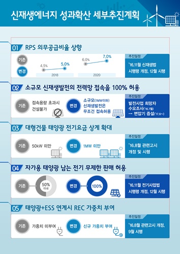 에너지신산업 성과 확산 종합 대책은 태양광·풍력 등의 신재생에너지 분야에 대한 규제 완화 등의 내용을 포함하고 있다.