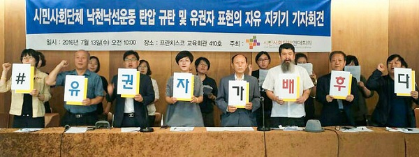 13일 오전 10시 시민사회단체연대회의 주최로 서울 중구 정동 프란치스코교육회관 410호에서 기자회견을 열어 “표적 수사를 통해 유권자 표현의 자유를 탄압한 것”을 강력 규탄했다.