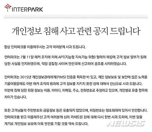 인터파크 측은 2차 피해를 일으킬 수 있는 주민번호, 아이디, 비밀번호 등 민감한 개인 신상정보는 유출되지 않았지만 이름, 아이디(ID), 이메일주소, 주소, 전화번호 등은 유출됐다고 밝혔다.