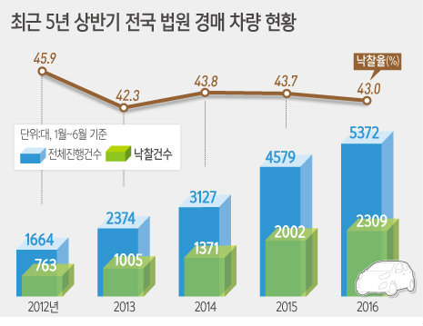 최근 5년간 수치를 보면 2012년 상반기만 해도 1664건이었던 차량 경매는 이듬해 2374건으로 40% 넘게 증가했다.