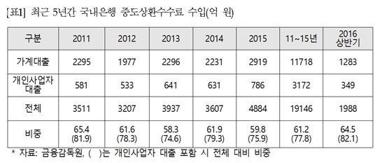 제윤경 더불어민주당 의원이 금융감독원으로부터 제출받은 '국내은행별 중도상환수수료 수입 현황' 자료에 따르면 지난해 은행의 중도상환수수료 수입은 2014년 대비 35.4% 급증한 4884억원으로 사상최고치를 기록했다고 20일 밝혔다.