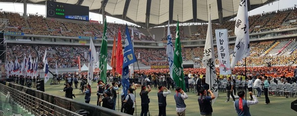 23일 오후 서울 상암 월드컵경기장에서 열린 한국노총 전국금융산업노동조합(금융노조, 위원장 김문호) 결의대회에서는 조합원 5만 여명이 모였다.