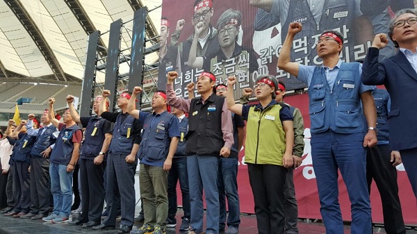 이날 김주영 공공노련 위원장은 “임금피크제, 성과연봉제, 강제 퇴출제 등 재벌의 요구사항을 해소해주는 것을 넘어 에너지 공기업마저 넘겨주려는 정부의 폭주를 멈춰야 한다”며 “불법 이사회 의결로 도입한 성과연봉제를 철회하고 강제퇴출제 지침을 백지화하며 공공기관 개혁을 올바르게 하기 위해 정부측은 노동계와의 대화에 나서라”고 촉구했다.