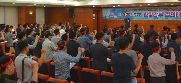 23일 오전 한국노총 전국공공노동조합연맹 서울메트로노동조합도 200여명의 현장간부가 참석한 가운데 서울 성동구 신답 별관 강당에서 ‘성과연봉제 저지 현장간부 결의대회’를 열어 오는 27일 오전 합법적 파업에 돌입하기로 결의했다.