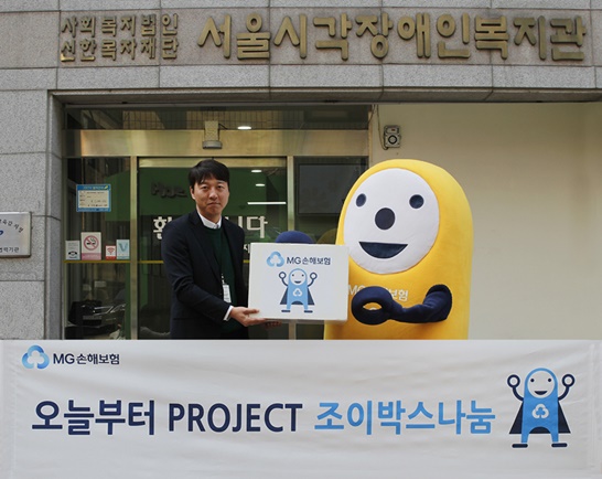 MG손보 캐릭터인 행복요정 '조이'가 직접 복지관에 출동해 팬들의 사랑과 응원 댓글을 적립해 만든 '흰지팡이 조이박스' 전달식을 가졌다.