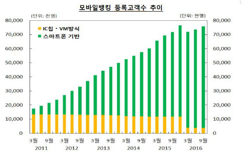 한국은행이 16일 발표한 '2016년 3분기 국내 인터넷뱅킹서비스 이용현황'에 따르면 9월 말 기준 스마트폰뱅킹 등록고객수는 전분기 대비 3.2%(226만명) 늘어난 7203만명을 기록했다.