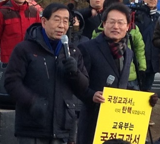 박 시장은 "성과연봉제와 국정교과서는 완전히 폐지돼야 한다"며 "일본과 합의를 한 위안부 할머니 문제도 보상합의를 철회해야 한다"고 밝혔다.
