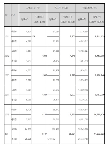 새누리당 심재철 의원이 통계청과 국토교통부로부터 제출받은 자료에 따르면, 연도별로 사업체 수는 적게는 74개, 많게는 332개 차이가 났고, 종사자 수도 적게는 4,549명, 많게는 8,831명 차이가 났다. 매출액의 경우도 적게는 8조원, 많게는 14조원까지 차이가 나는 것으로 나타났다.